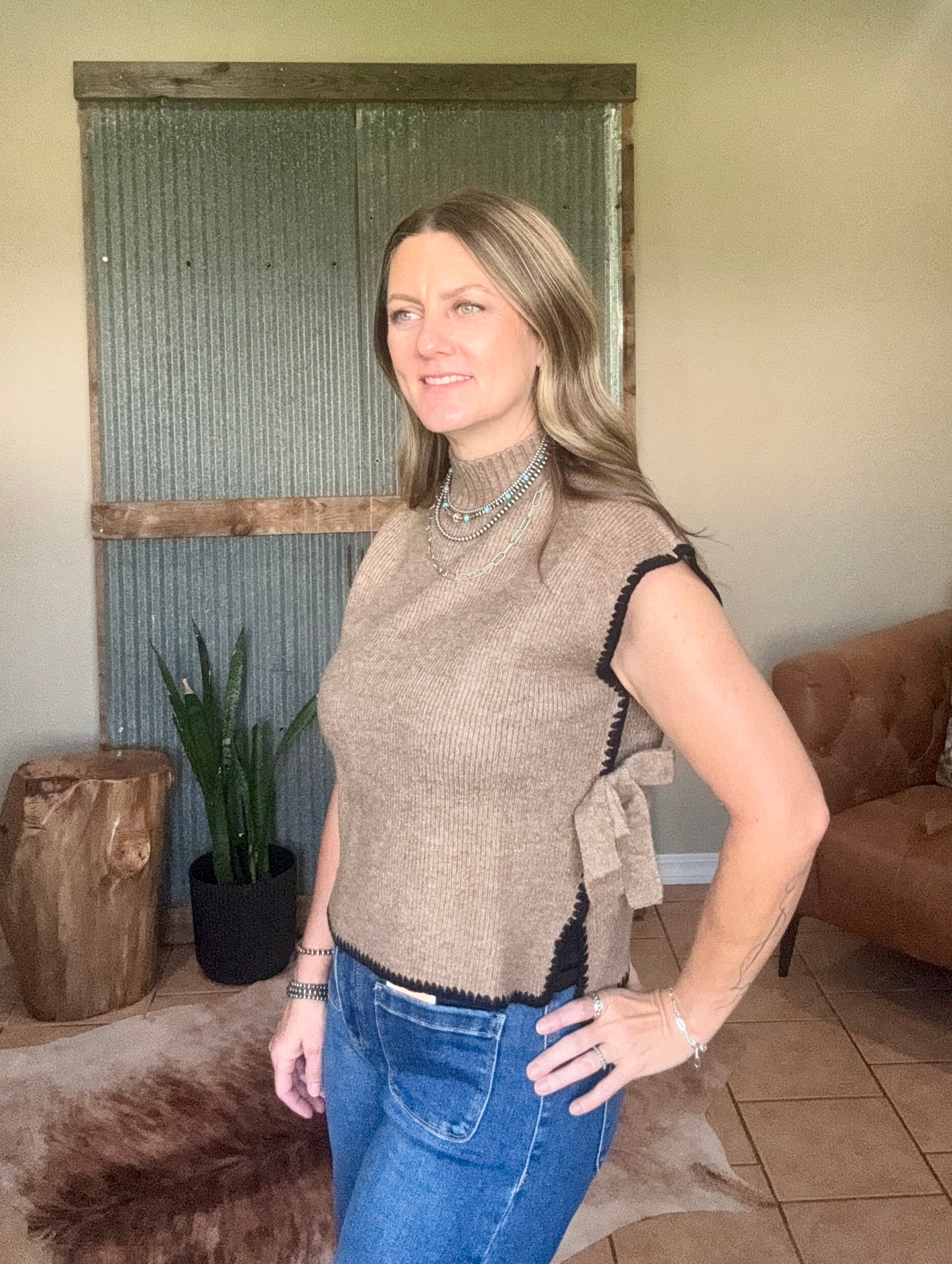 MOCK NECKLINE EXTENDED SHOULDER SLEEVELESS SIDE TIE DETAIL CONTRAST STITCH TRIM DETAIL 70%ACRYLIC 26%POLYESTER 4%SPANDEX