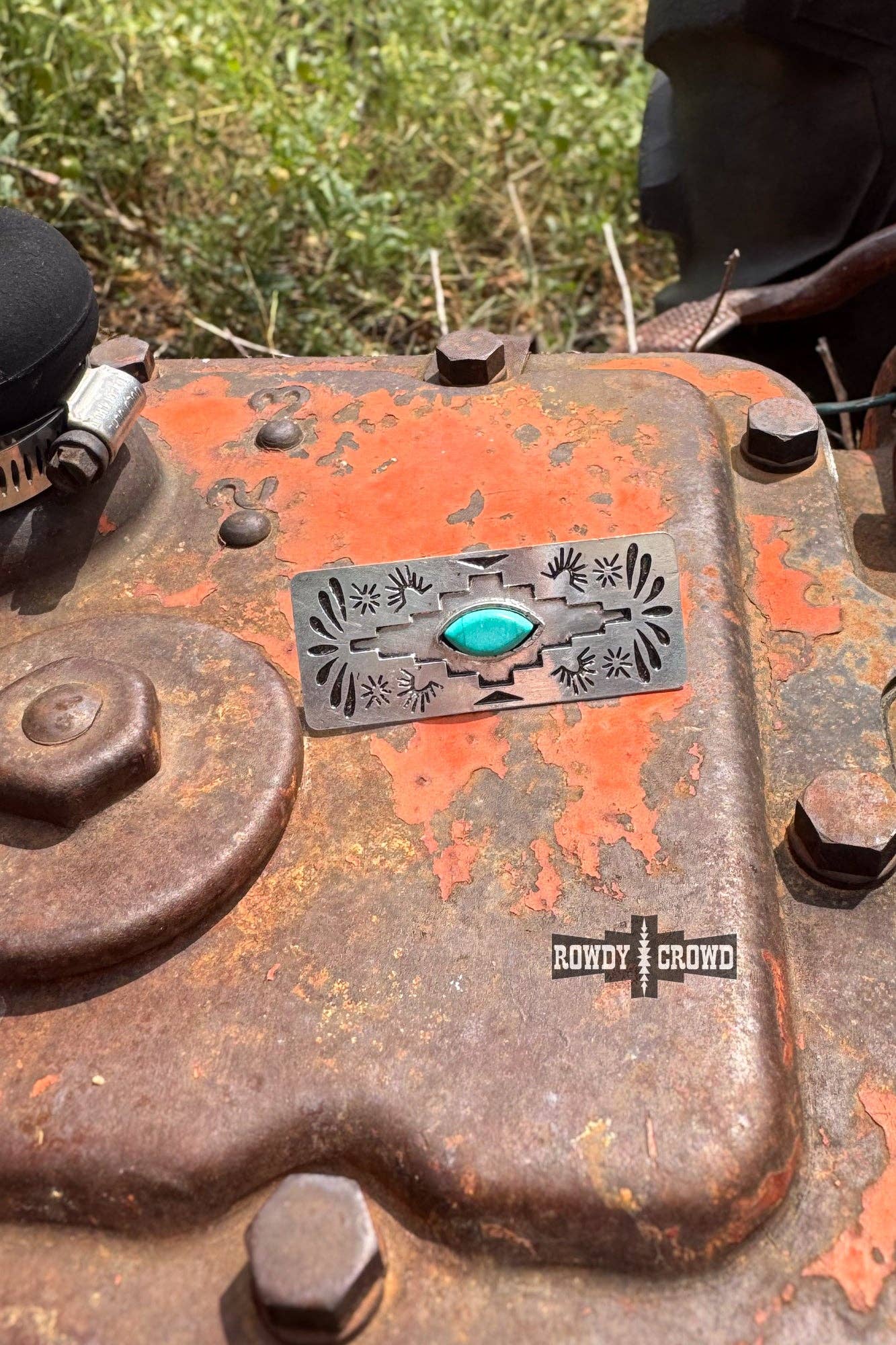 The Saguaro Scarf Slide showcases a vibrant turquoise bead at its center, framed by bold Aztec stamping and floral-inspired petal and sunburst details on each side. A perfect blend of rugged tradition and refined Western charm. * Pendant Size: 2.25 in