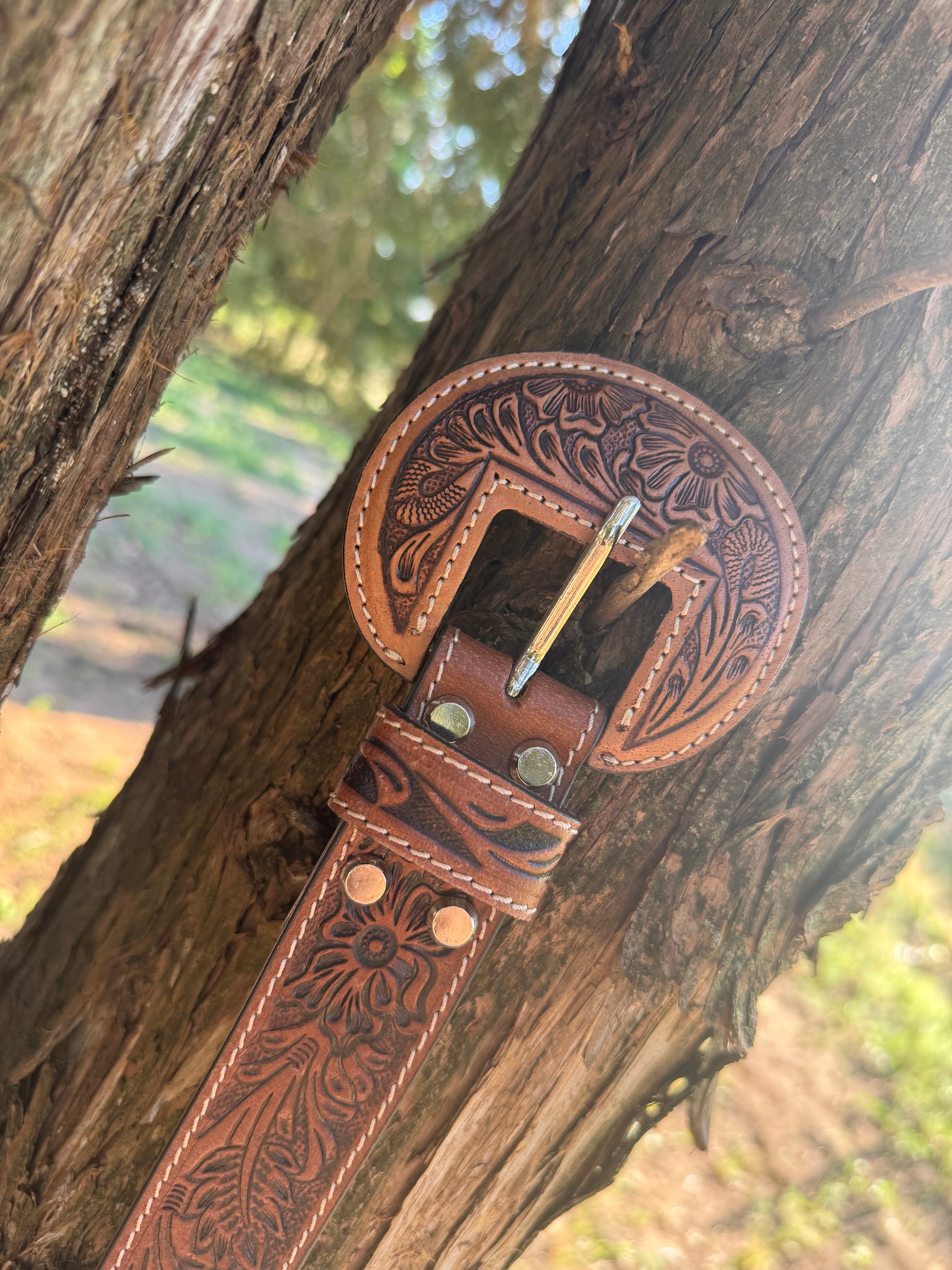This beautiful hand tooled belt is 100% leather. Where it every day with your jeans and boots, while you're working or in the arena. You can also add it to your favorite Friday night outfit. Medium is "29 from middle hole.